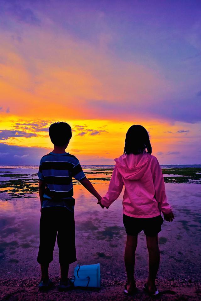 Wallpaper Little boy and girl stand by the water on sunset background