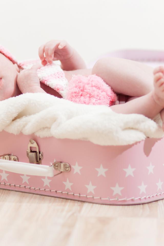 Wallpaper Little baby sleeping in a pink suitcase