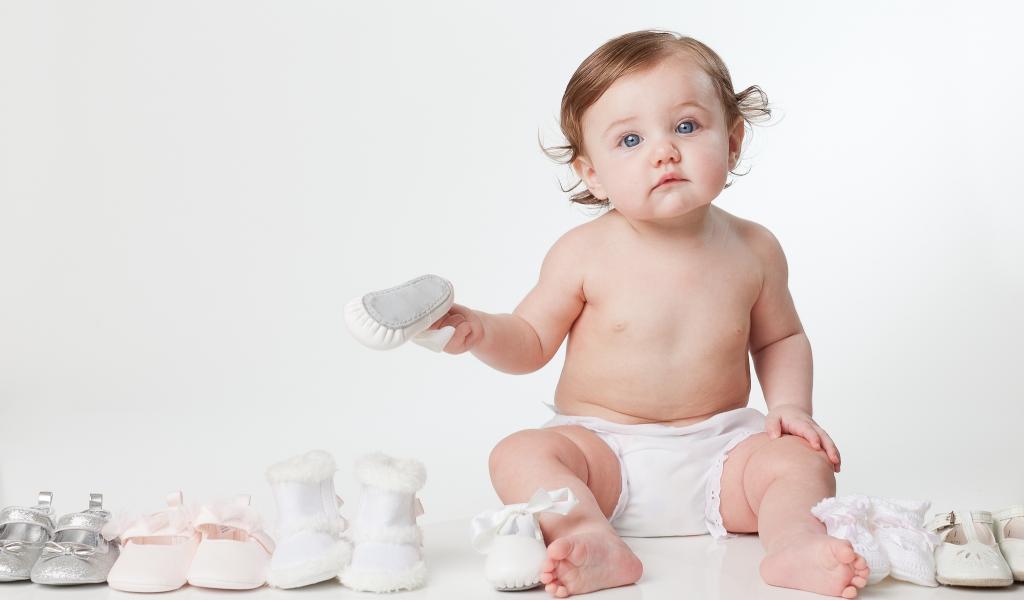 Wallpaper Little funny blue-eyed baby with shoes on a white background
