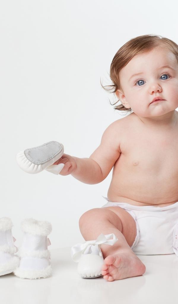 Wallpaper Little funny blue-eyed baby with shoes on a white background