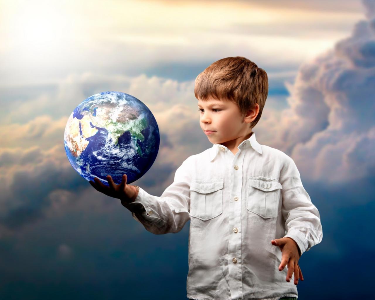Wallpaper Little boy with the planet earth in his hand