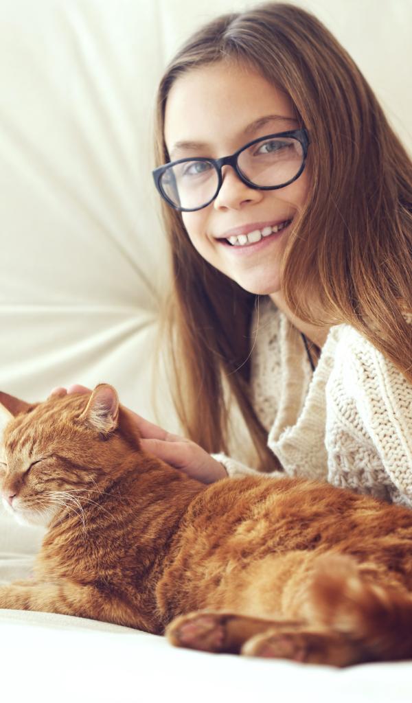 Wallpaper Girl in glasses on the bed with a red cat