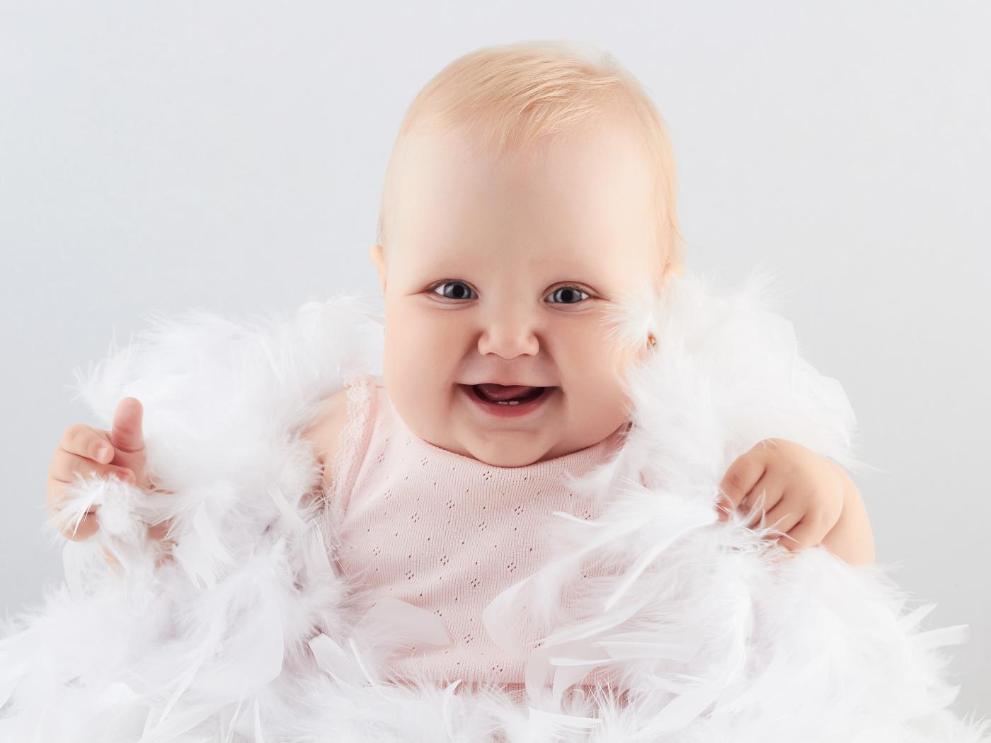 Wallpaper Funny smiling little girl in white feathers
