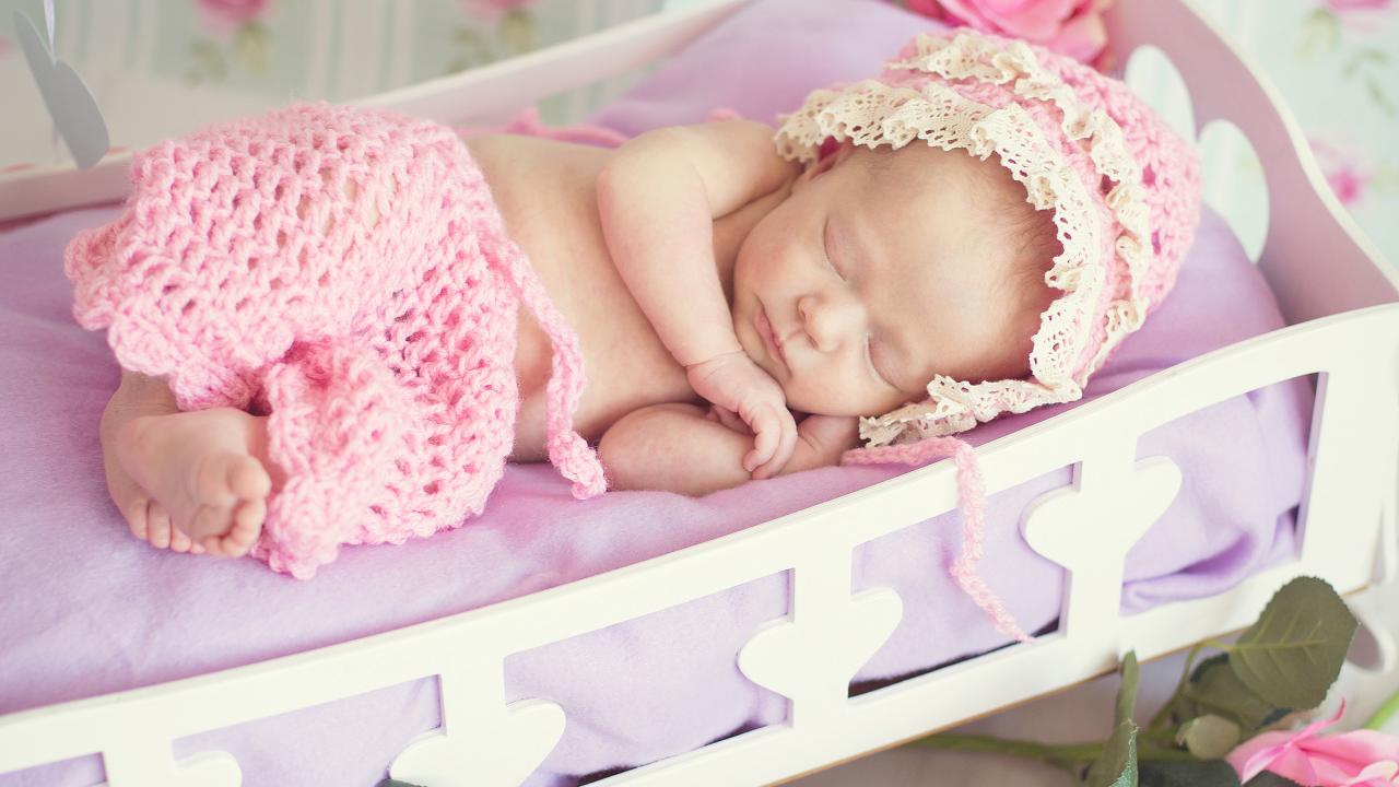 Wallpaper A sleeping baby girl in a pink suit in a cradle