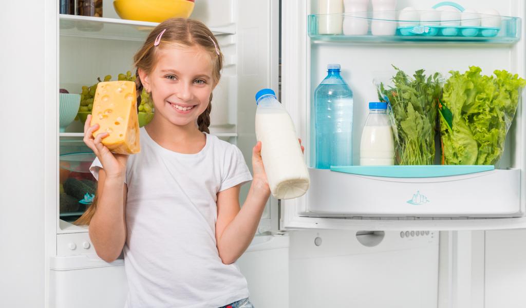 Wallpaper Smiling girl at the fridge with cheese and milk