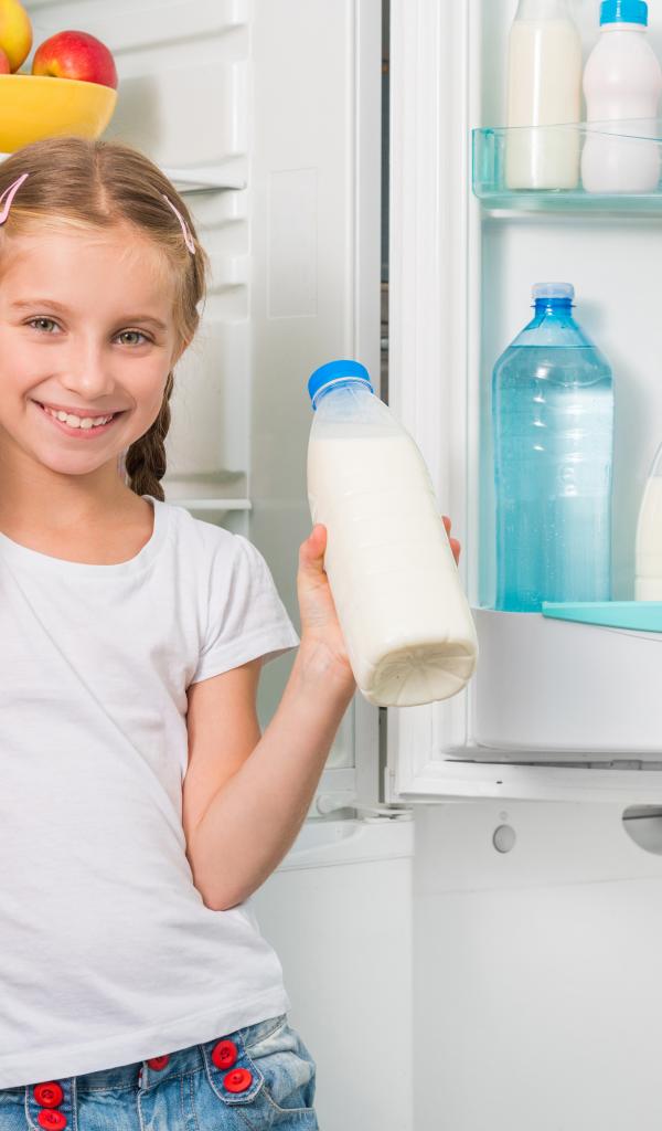 Wallpaper Smiling girl at the fridge with cheese and milk