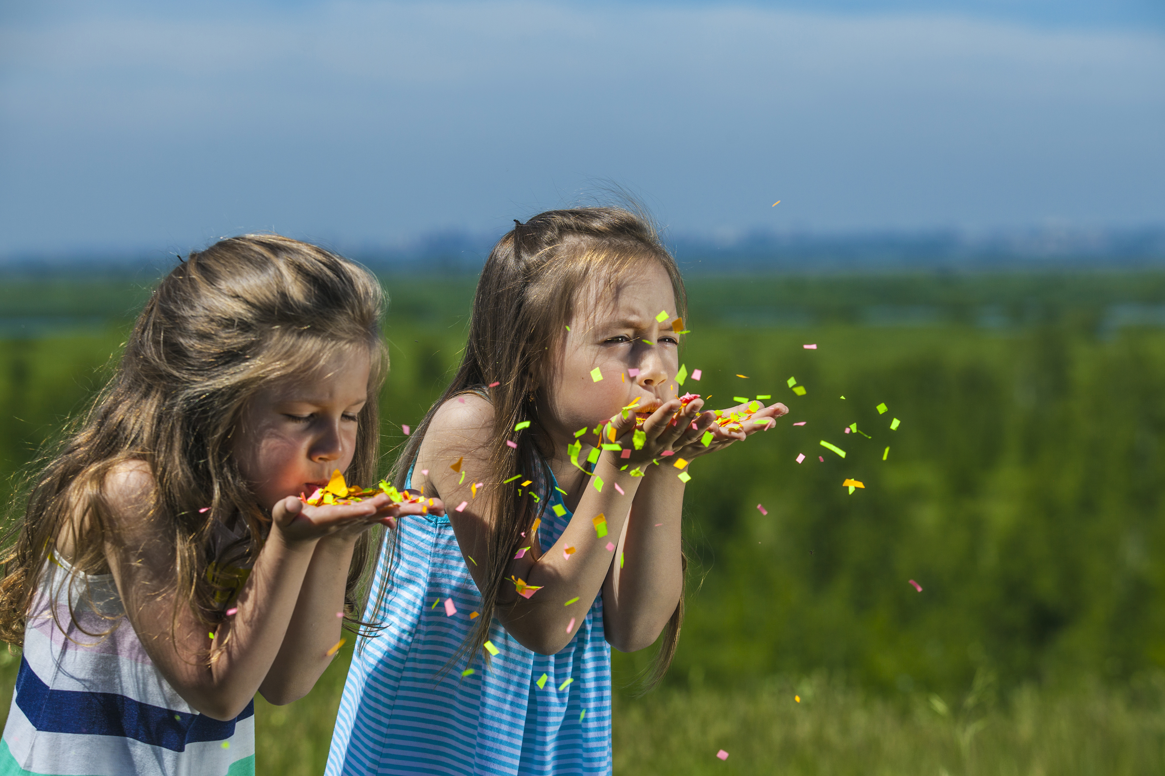 Wallpaper Two little girls blow confetti off their hands.