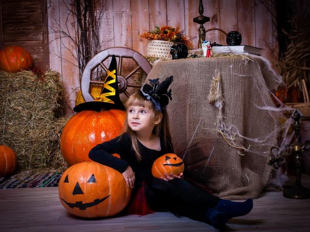 Wallpaper Little girl in a witch costume on a Halloween holiday