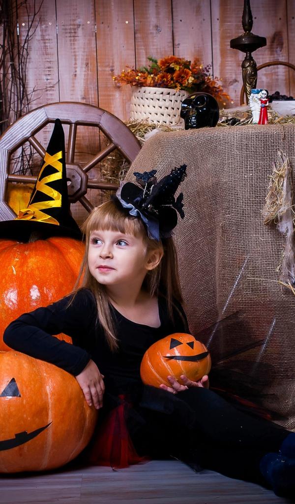 Wallpaper Smiling little girl in a witch costume with pumpkin on Halloween