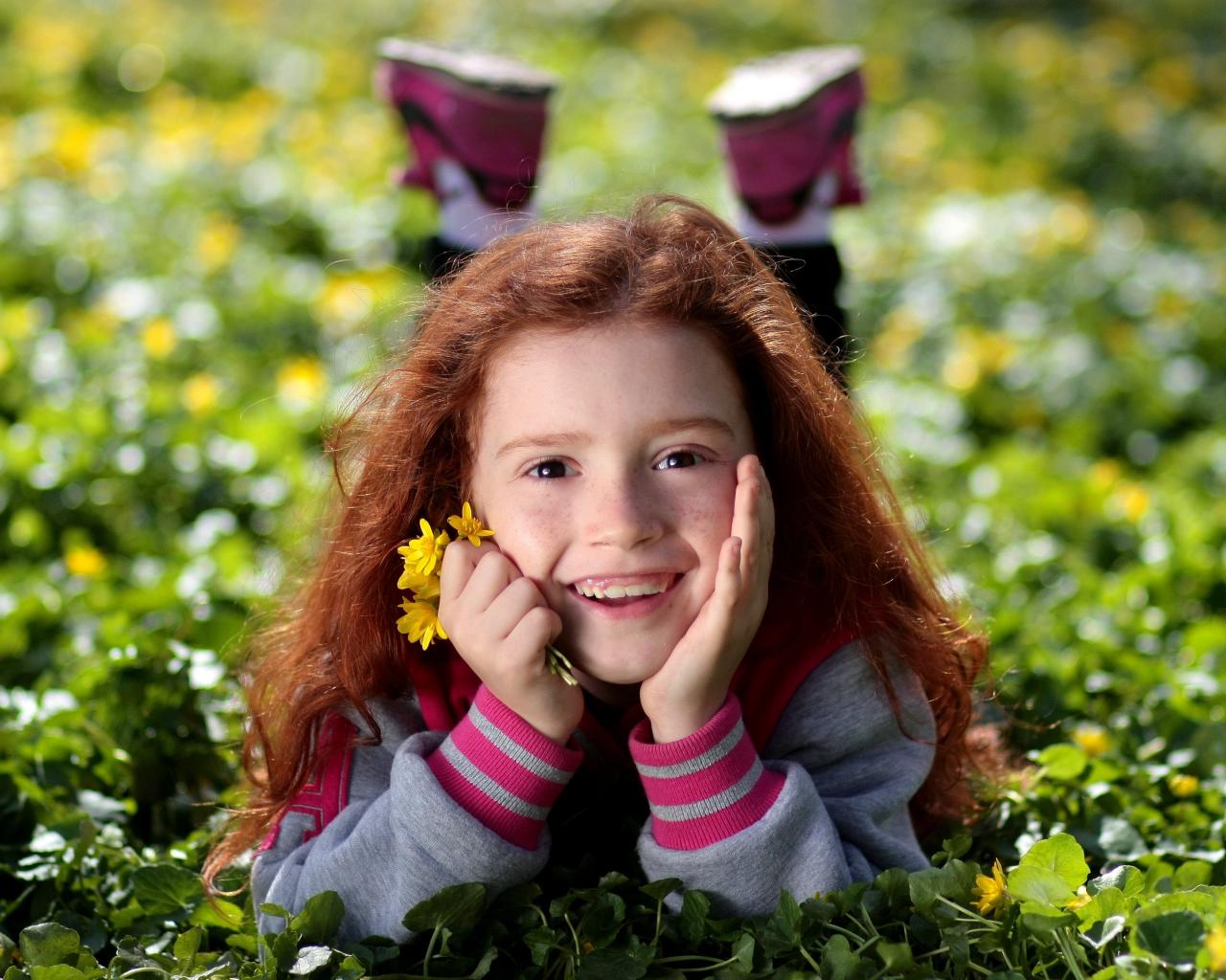 Wallpaper Smiling red-haired girl lying on the green grass