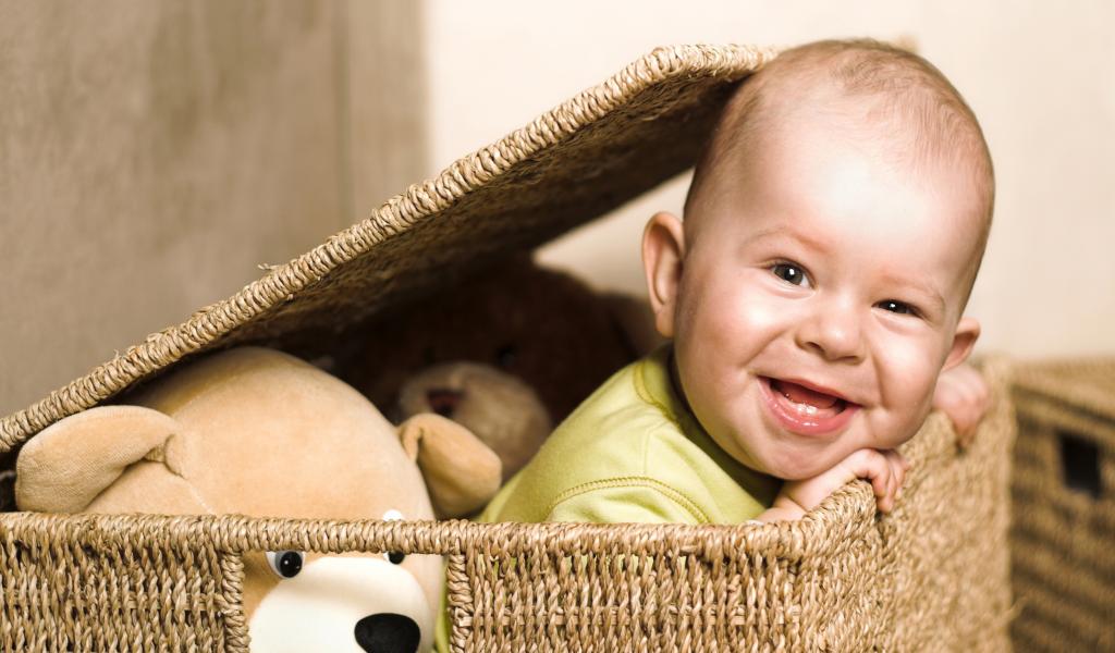 Wallpaper Smiling funny baby in wicker basket with toys