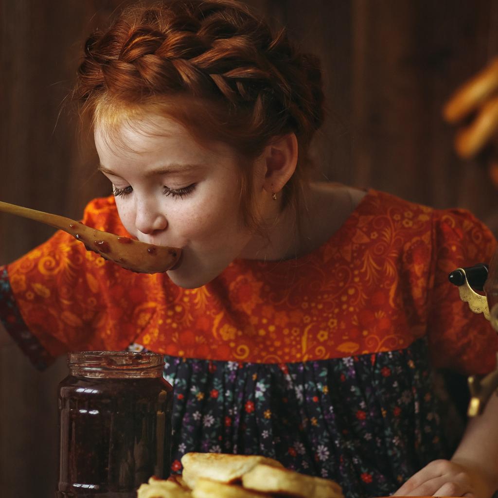 Wallpaper Little red-haired girl tries jam