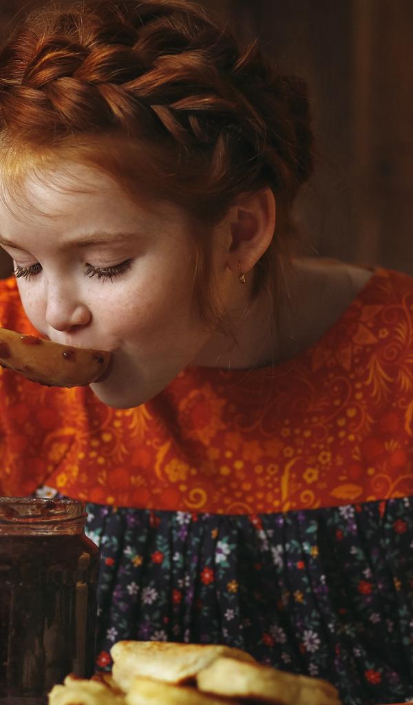 Wallpaper Little red-haired girl tries jam