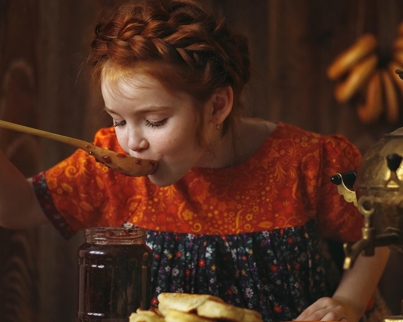 Wallpaper Little red-haired girl tries jam