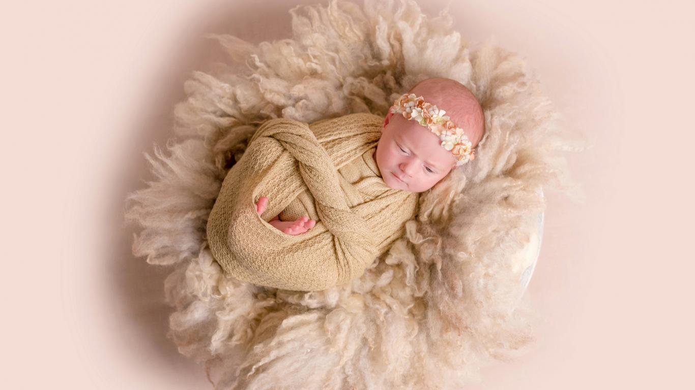 Wallpaper A baby in a knitted hat is sleeping in a white bedspread.