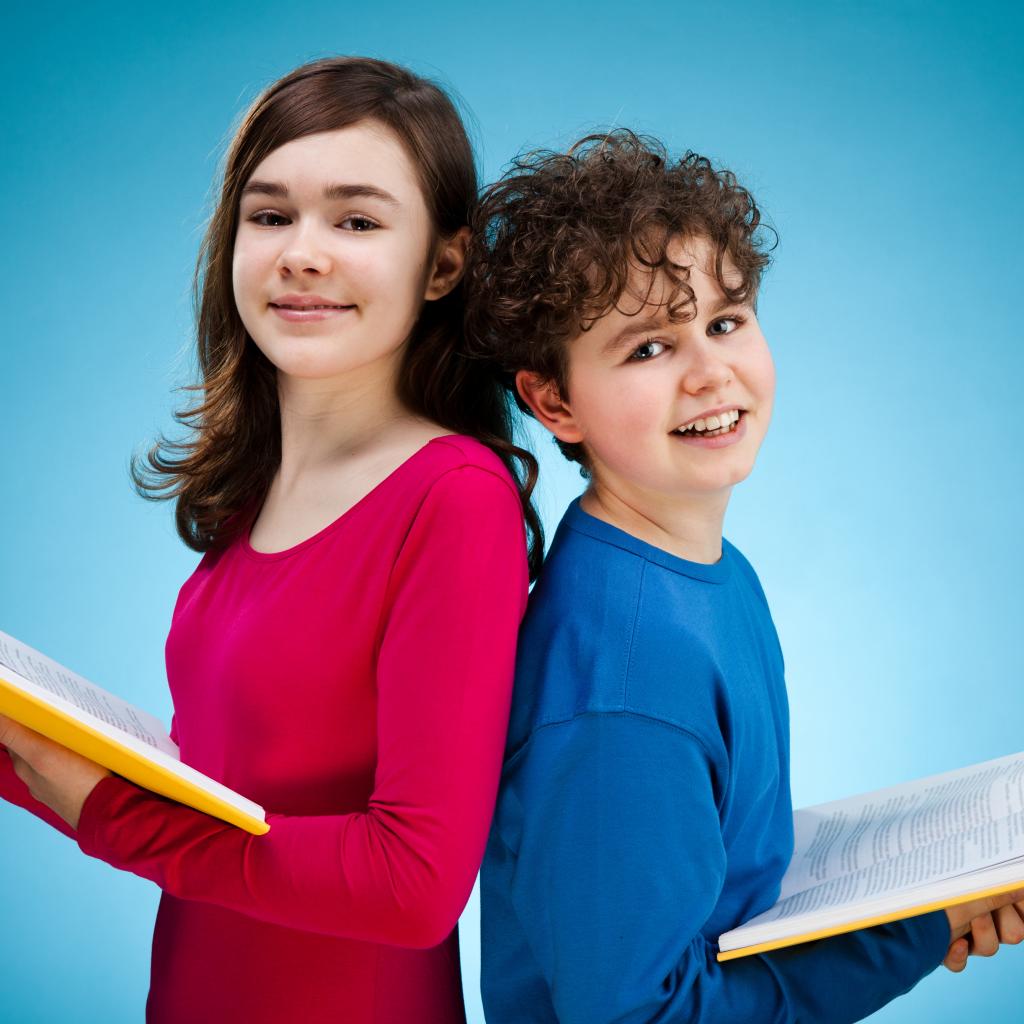Wallpaper Boy and girl with books on a blue background