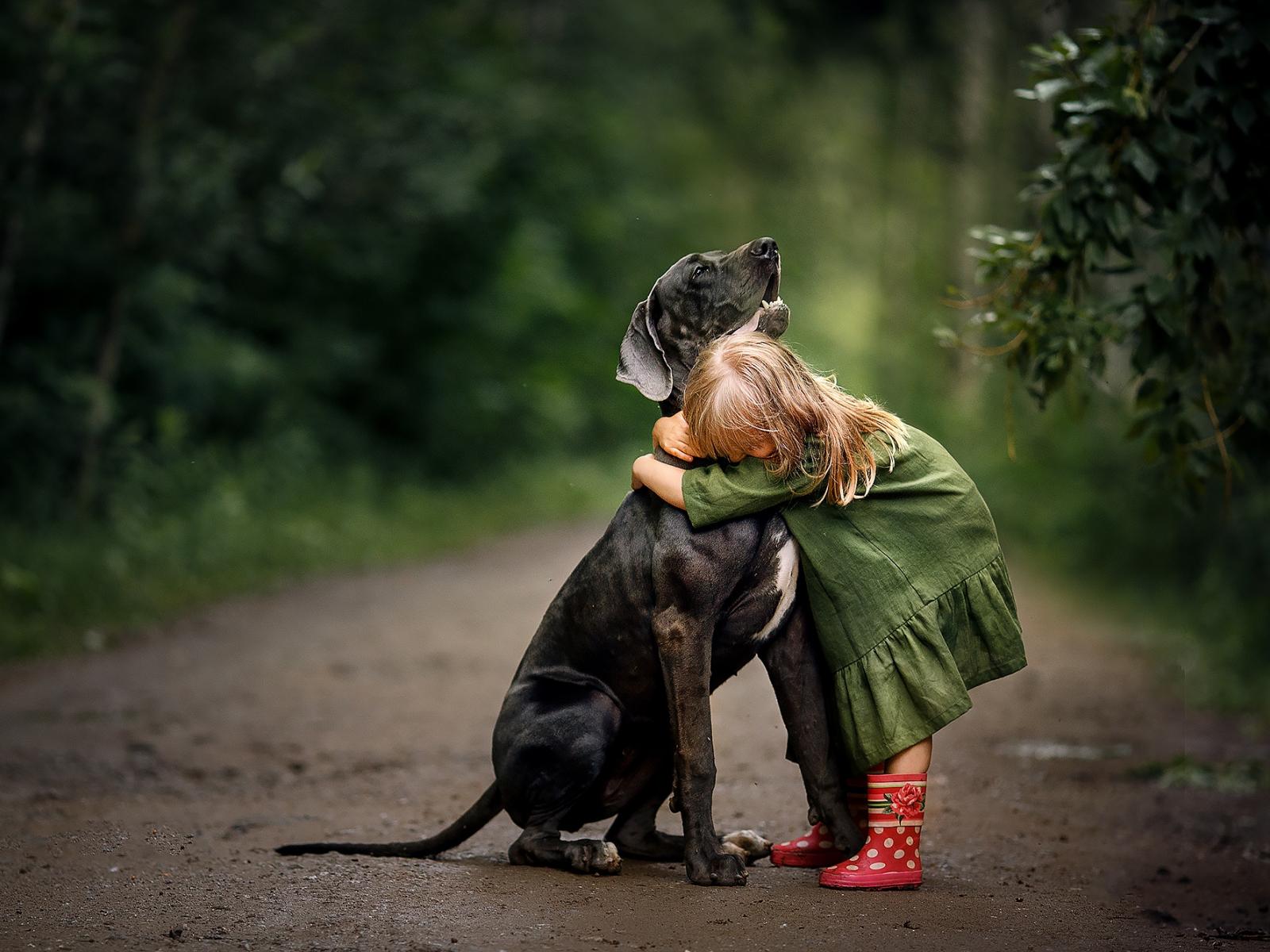 Wallpaper Little girl hugs a beagle dog on the bridge