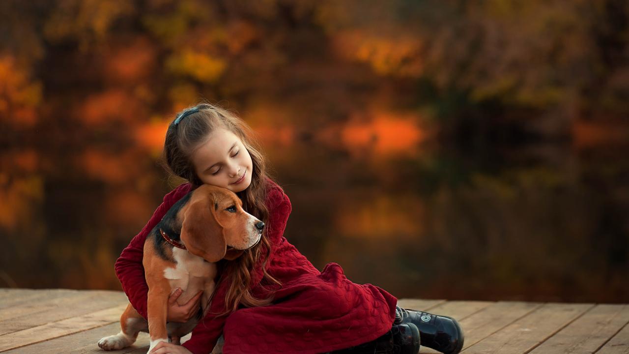 Wallpaper Little girl hugs a beagle dog on the bridge