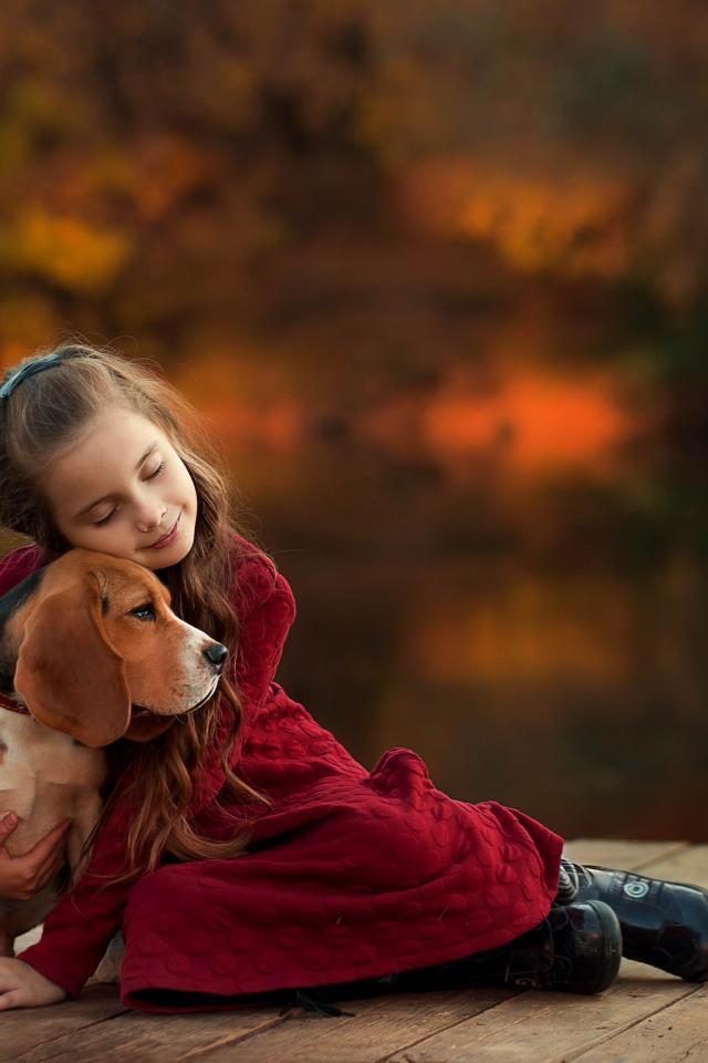 Wallpaper Little girl hugs a beagle dog on the bridge
