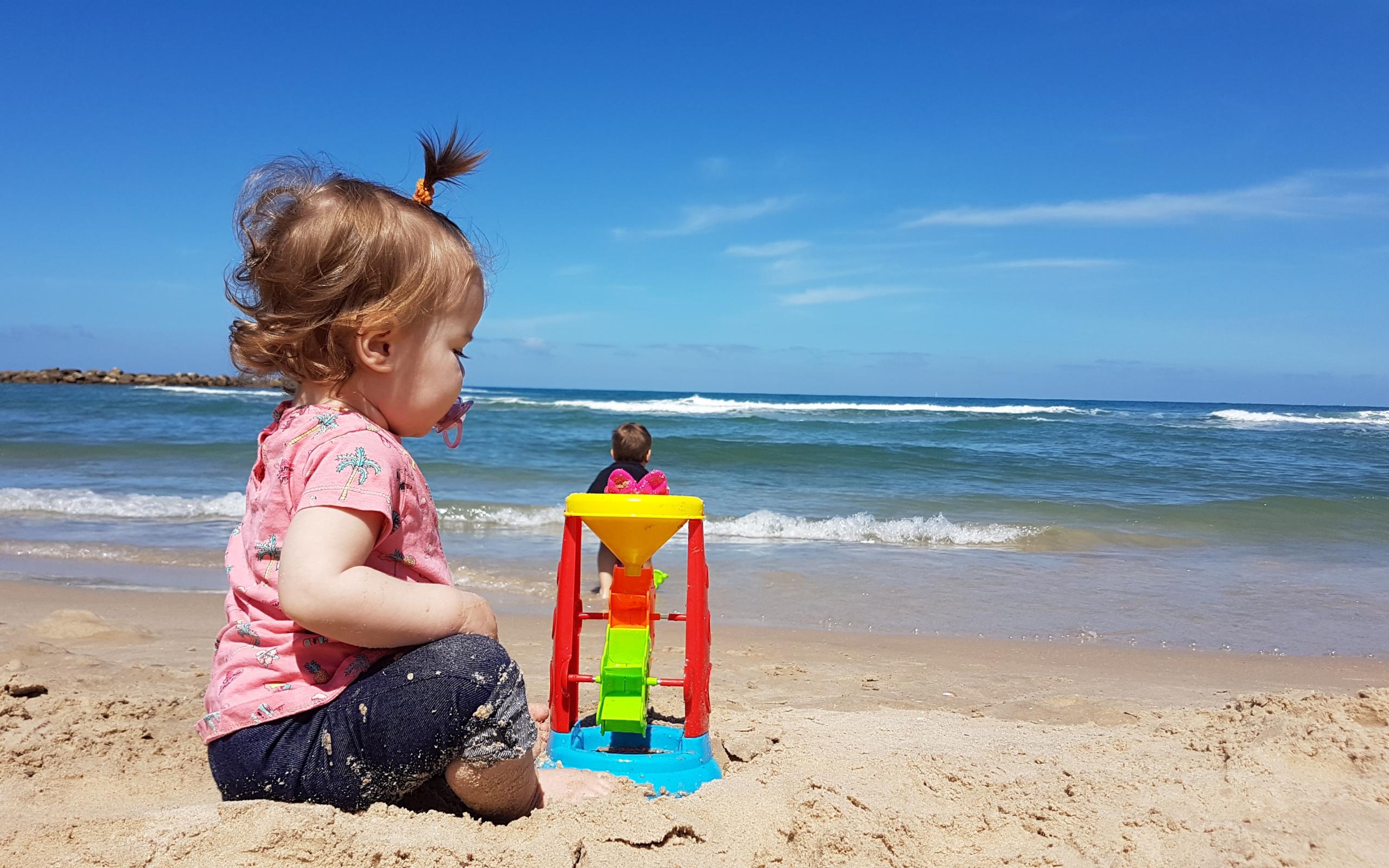 Wallpaper Little girl plays on the sand by the sea