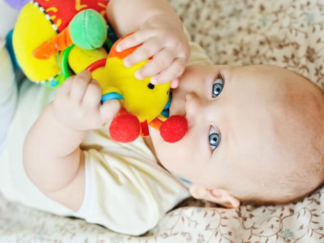 Wallpaper Little blue-eyed child nibbles a toy