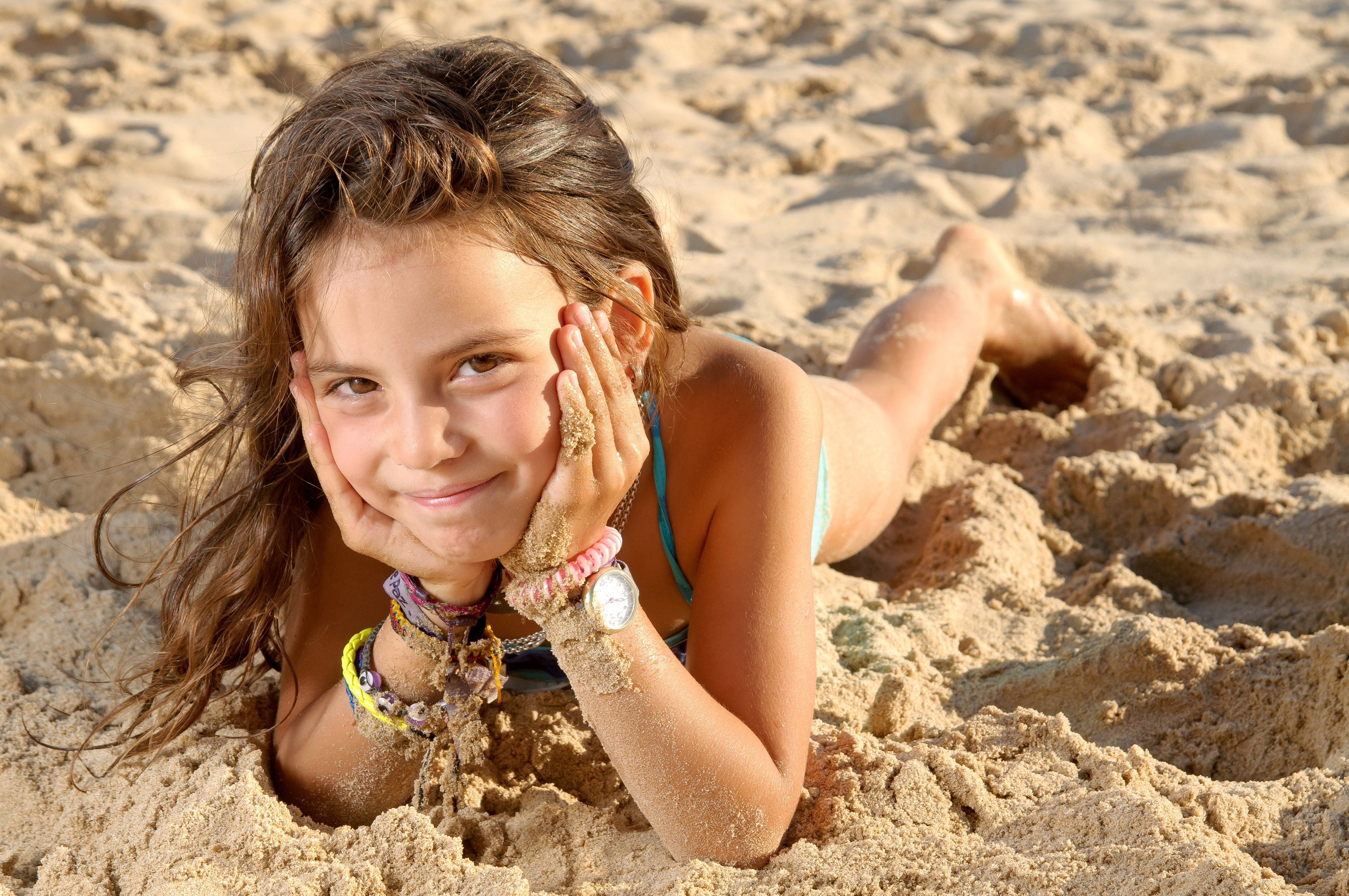 Wallpaper Little girl lies on the sand at the beach