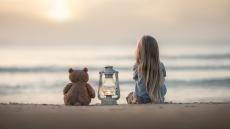 Wallpaper Little girl is sitting on the sand with a teddy bear