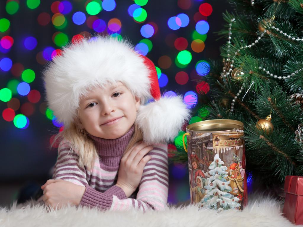Wallpaper Little girl in a Christmas hat at the Christmas tree