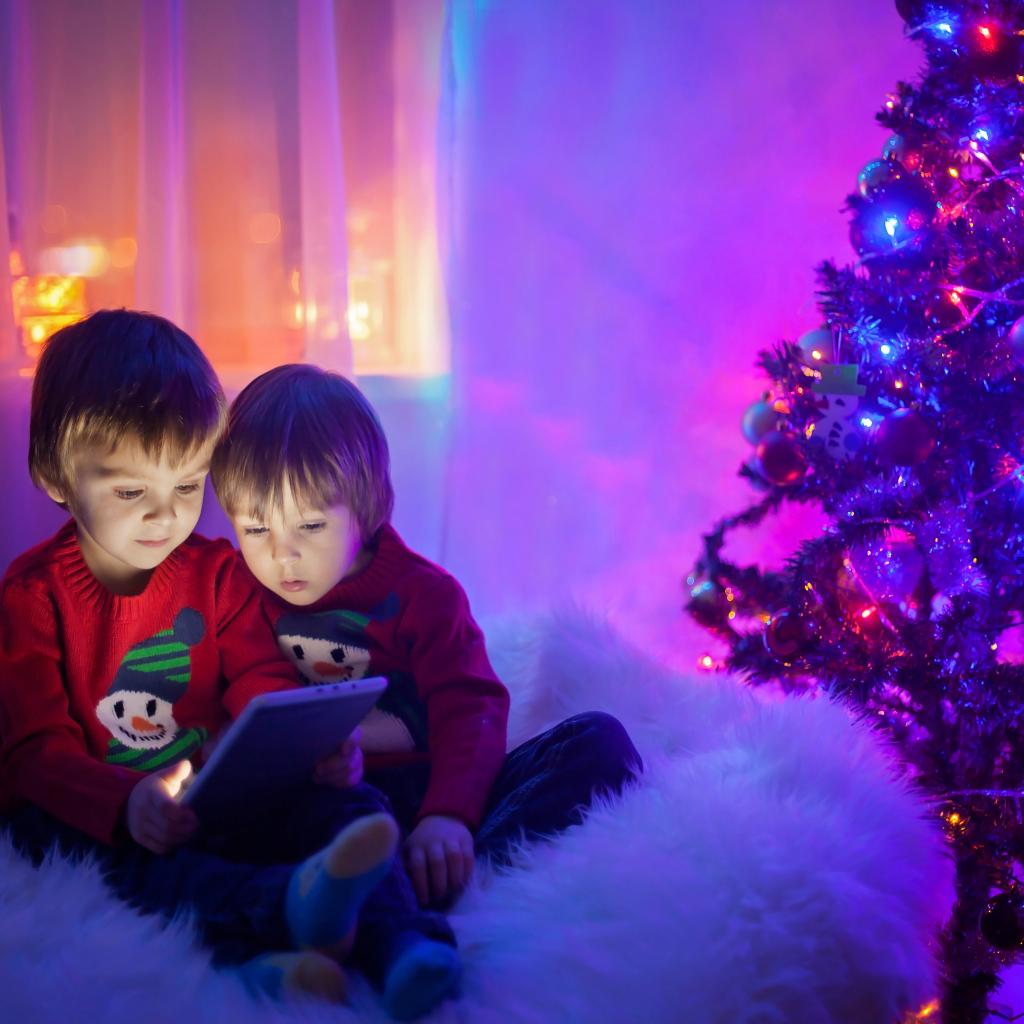 Wallpaper Two little boys watching cartoons by the New Year tree