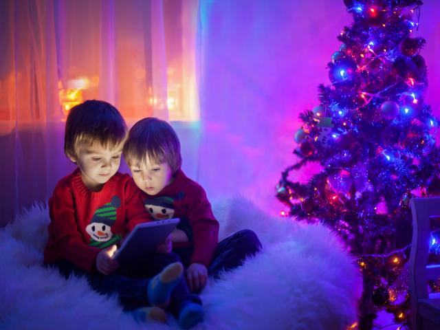 Wallpaper Two little boys watching cartoons by the New Year tree