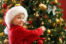 Wallpaper Little beautiful girl decorates a Christmas tree for the New Year.