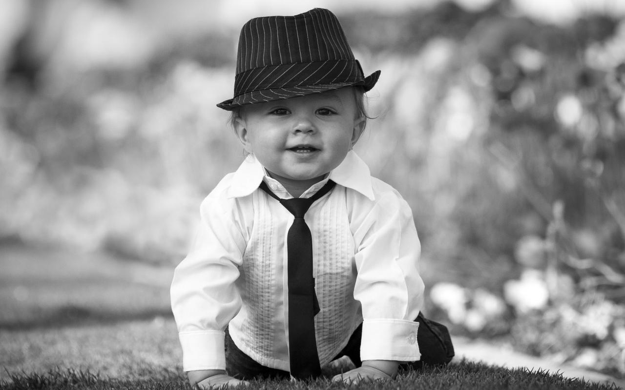 Wallpaper Little boy in a hat black and white photo