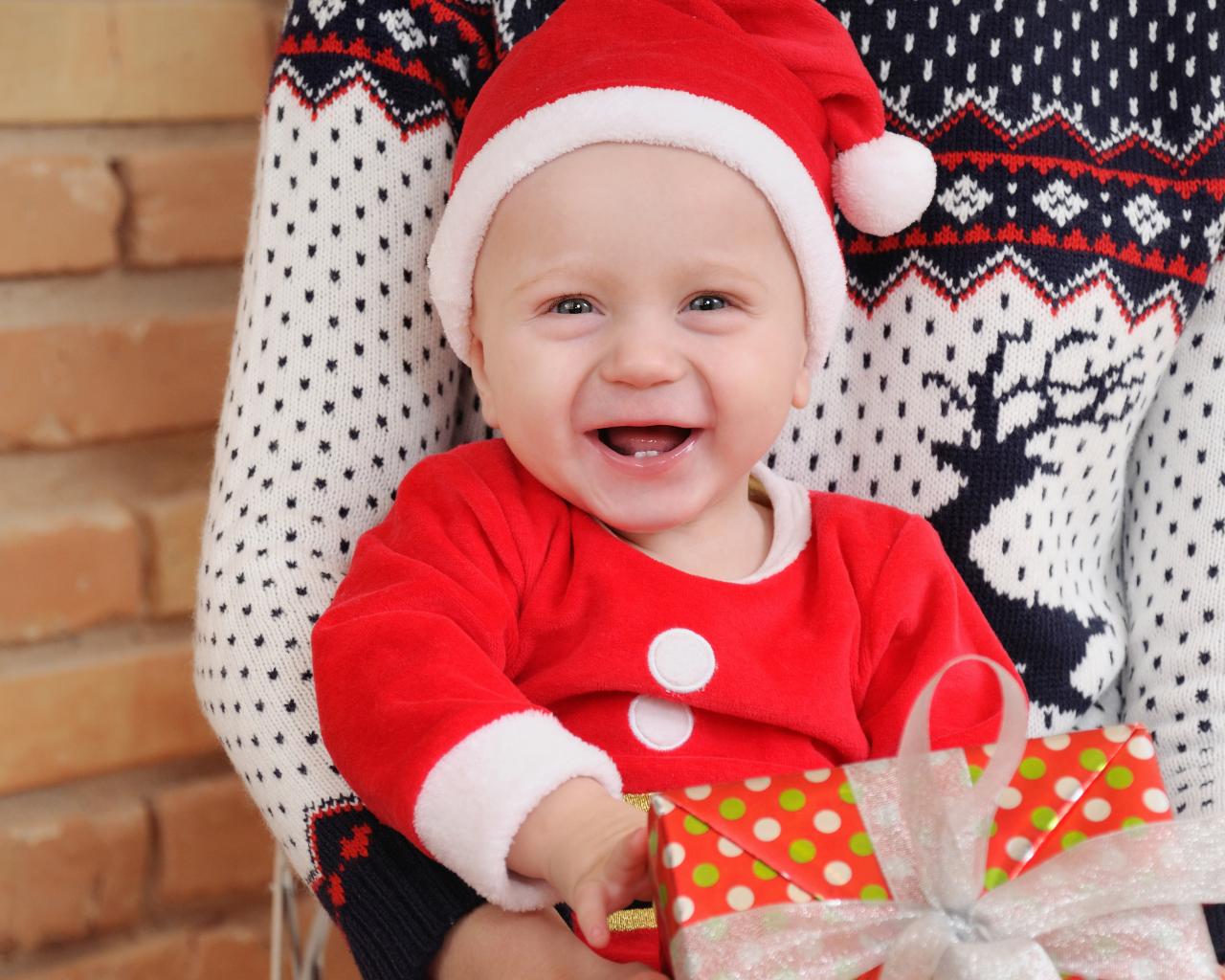 Wallpaper Smiling baby in a suit with a gift in his hands