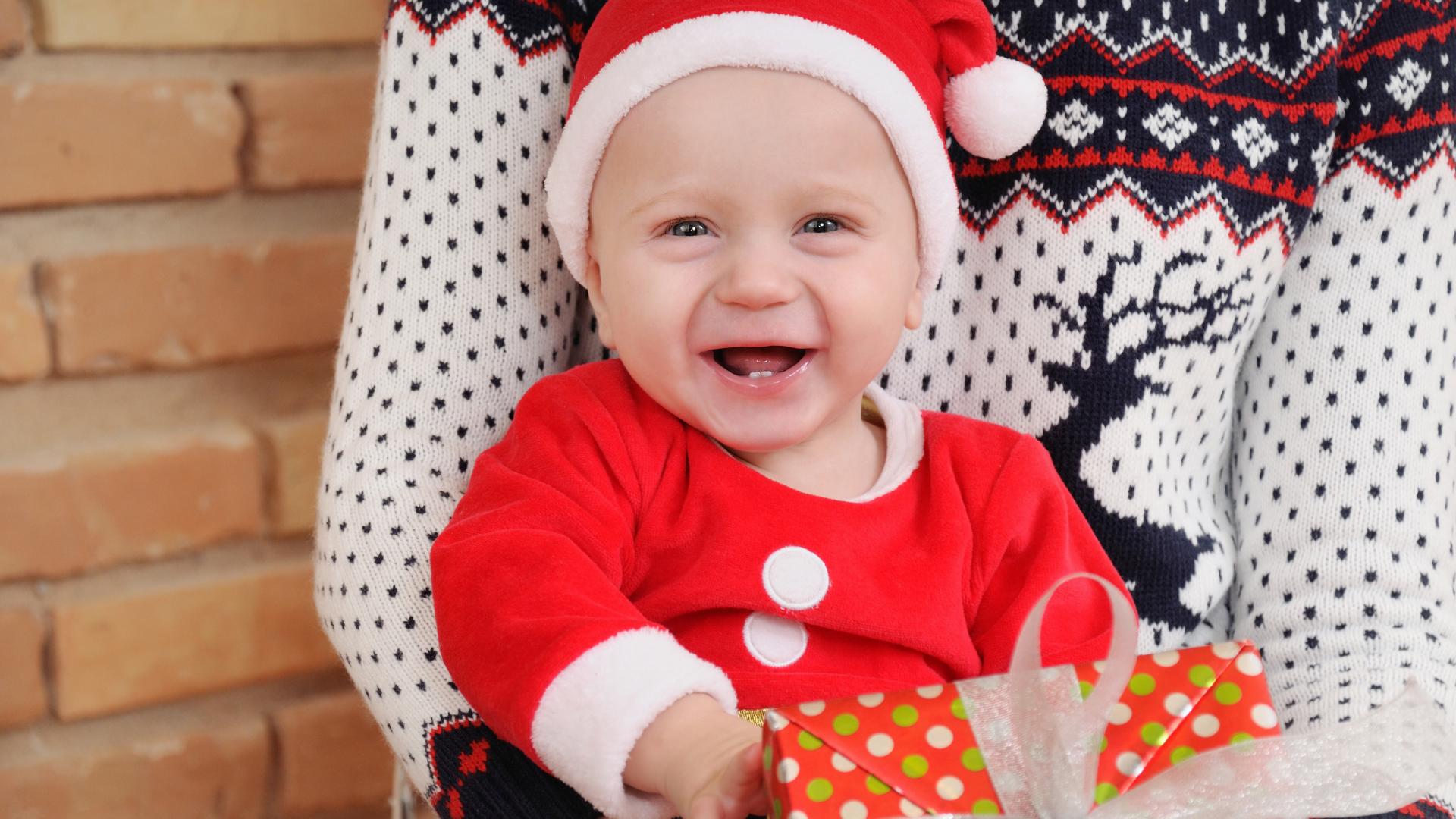 Wallpaper Smiling baby in a suit with a gift in his hands