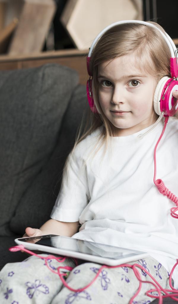 Wallpaper Girl sitting on a sofa with headphones and with a tablet