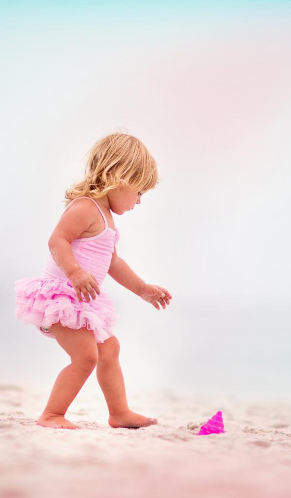Wallpaper Little girl in a pink swimsuit on the sand