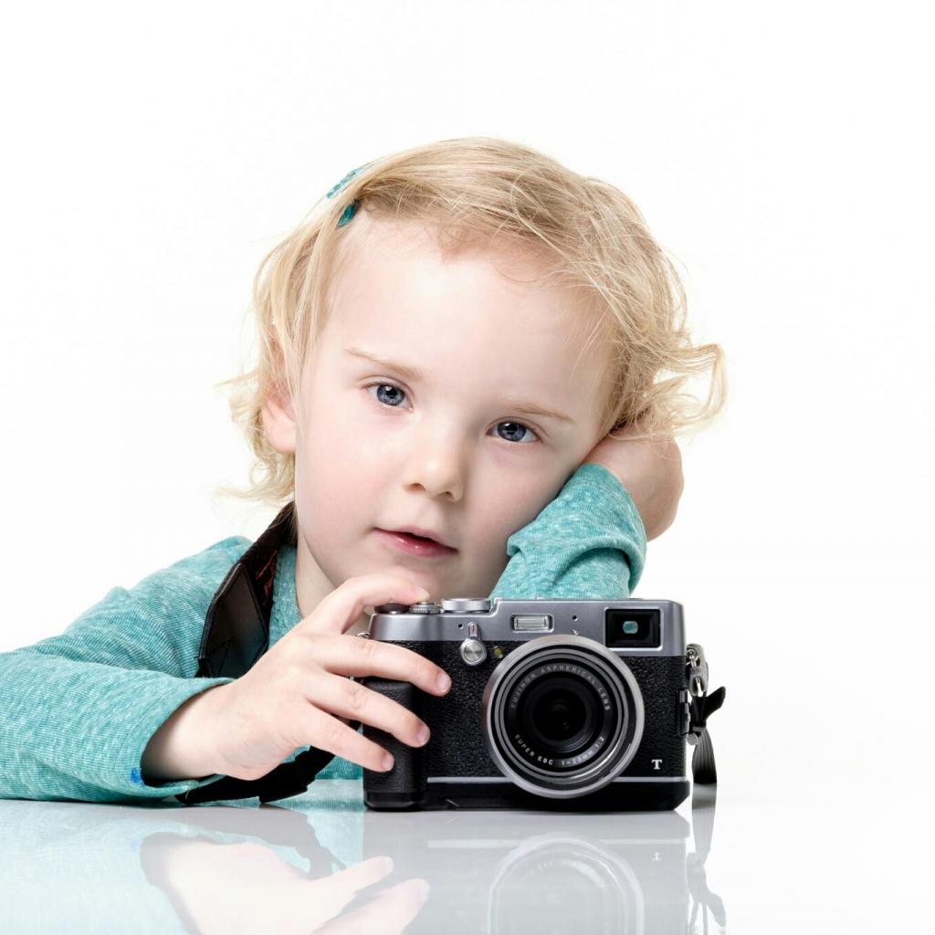Wallpaper Little girl with a camera on a white background