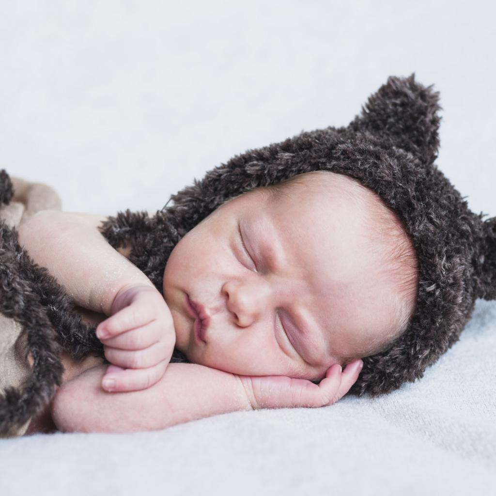 Wallpaper A small sleeping baby in a hat with ears is sleeping on the bed.