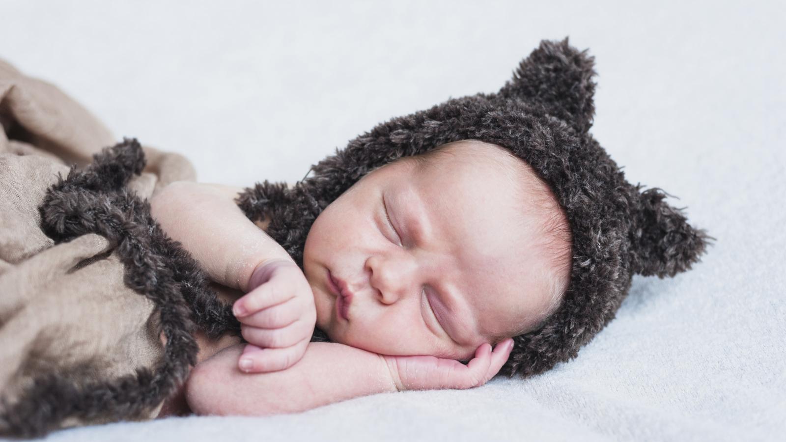 Wallpaper A small sleeping baby in a hat with ears is sleeping on the bed.
