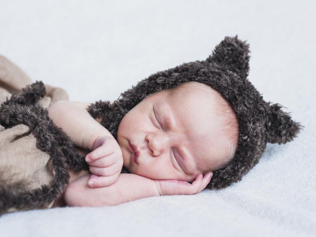 Wallpaper A small sleeping baby in a hat with ears is sleeping on the bed.