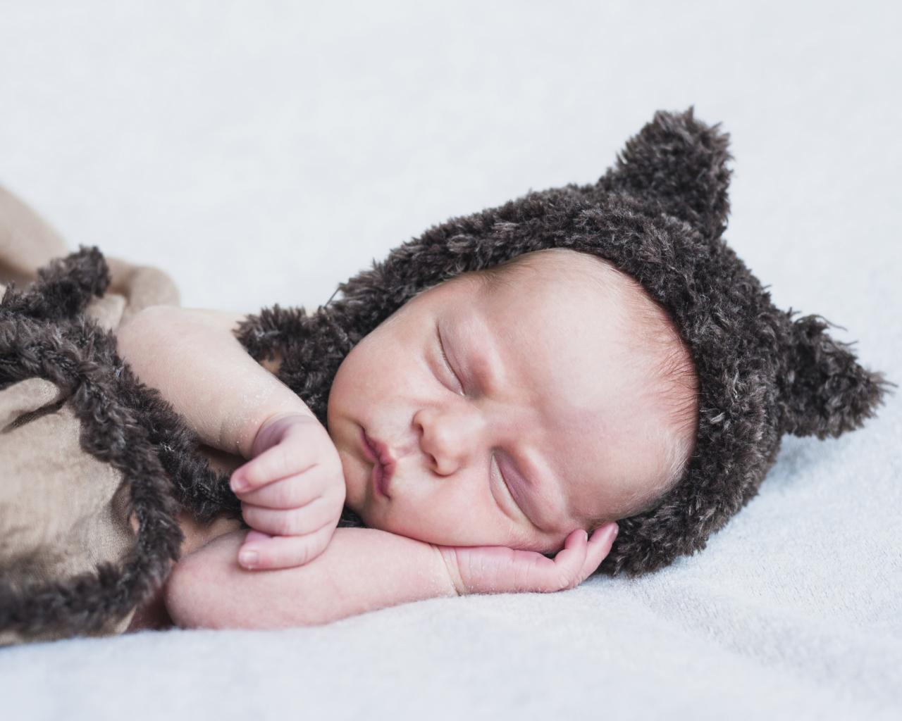 Wallpaper A small sleeping baby in a hat with ears is sleeping on the bed.