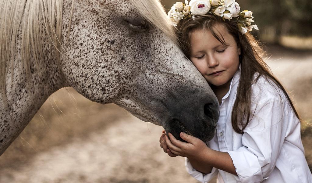 Wallpaper Little girl with a wreath on her head hugs a horse