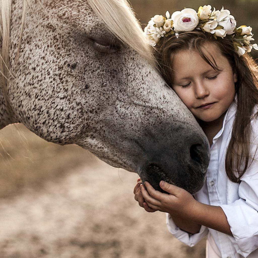 Wallpaper Little girl with a wreath on her head hugs a horse