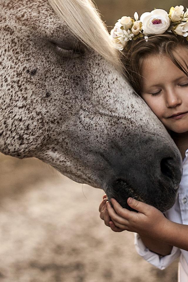 Wallpaper Little girl with a wreath on her head hugs a horse