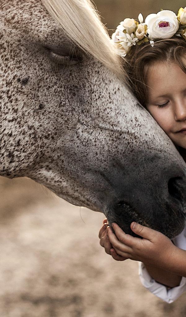 Wallpaper Little girl with a wreath on her head hugs a horse