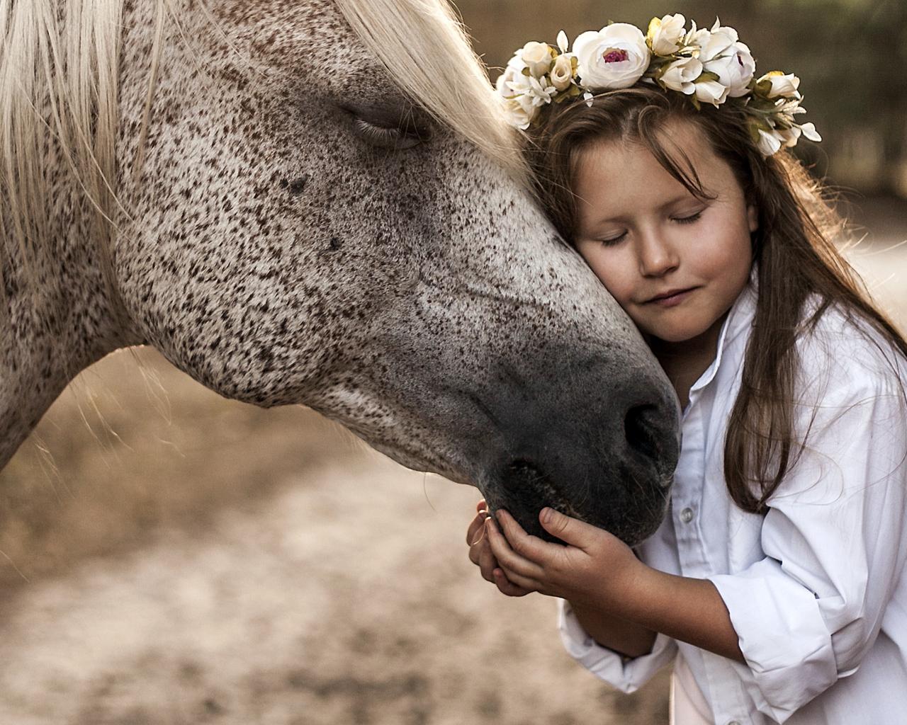 Wallpaper Little girl with a wreath on her head hugs a horse
