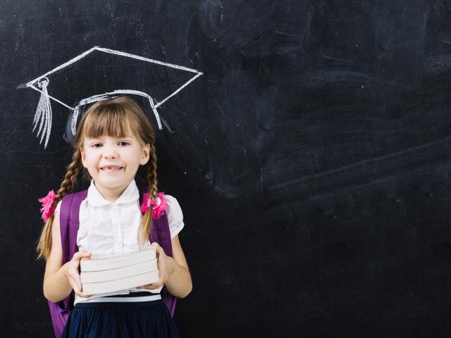 Wallpaper Little schoolgirl with books at the blackboard