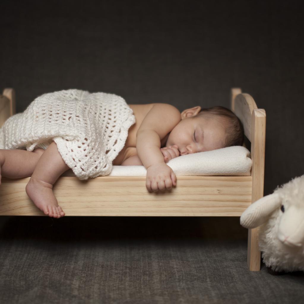 Wallpaper Little baby sleeps on a wooden crib with a toy