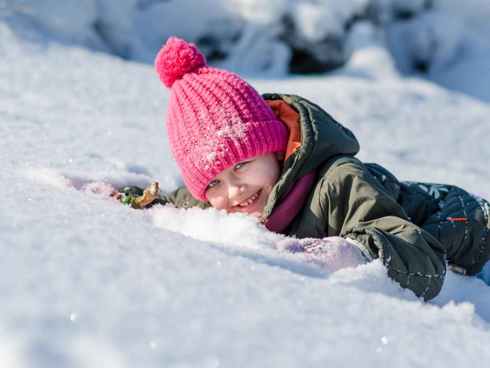 Wallpaper Little smiling girl lies in the snow