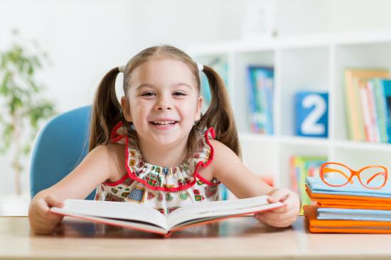 Wallpaper Smiling little girl reading a book